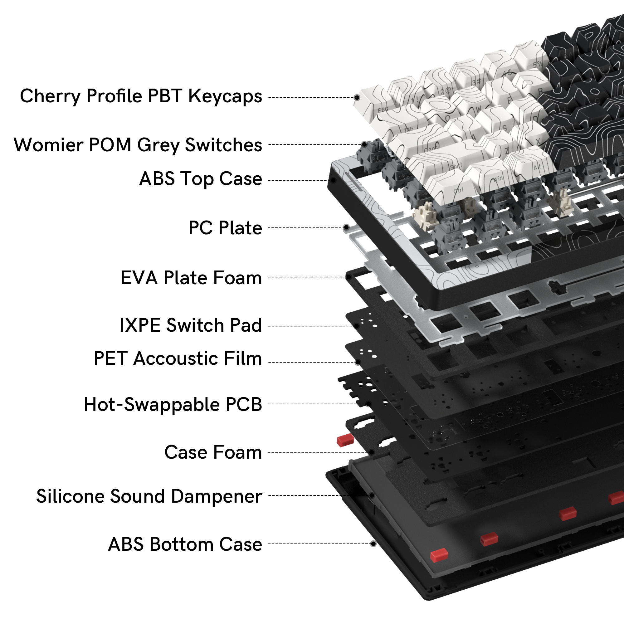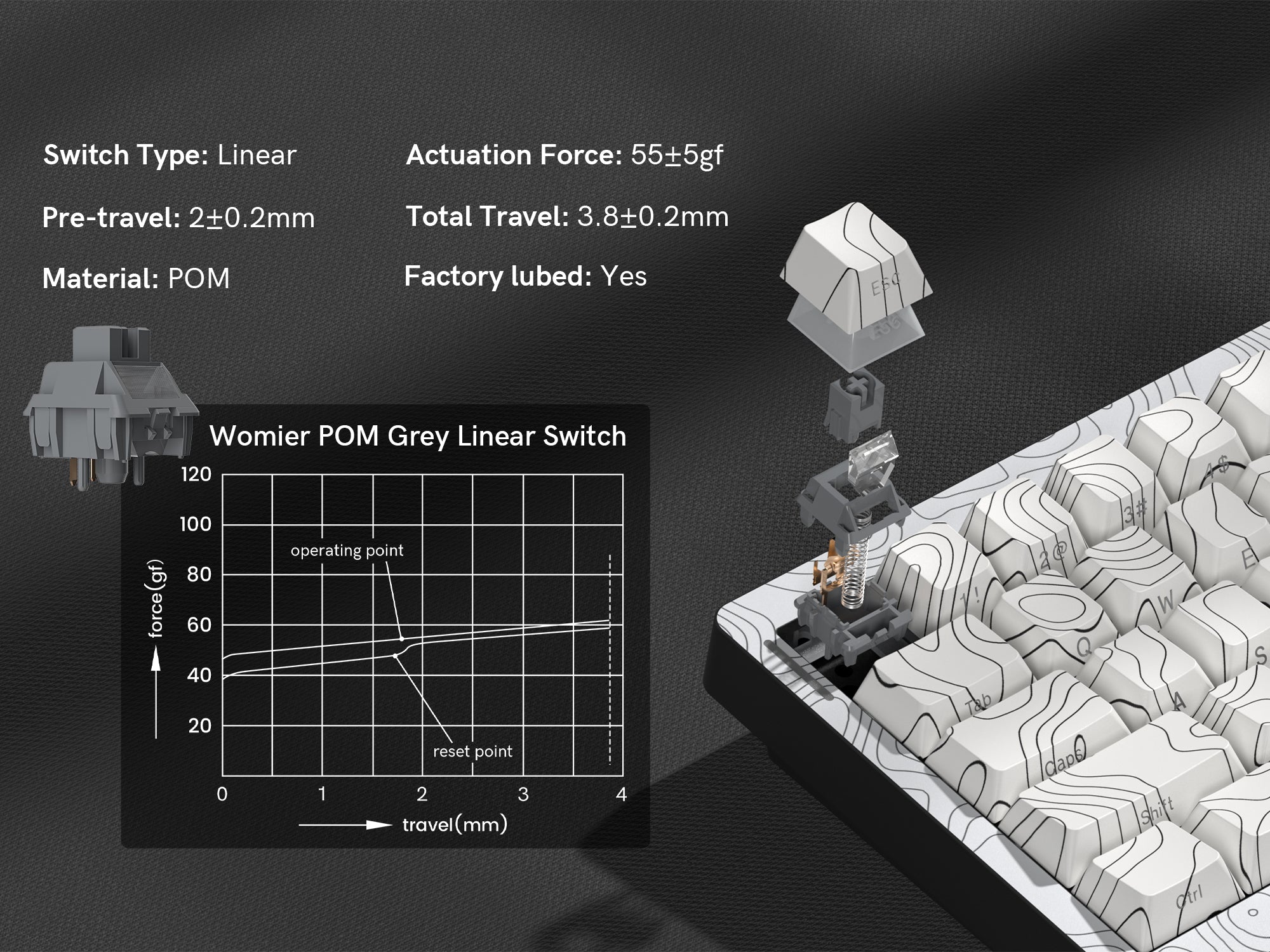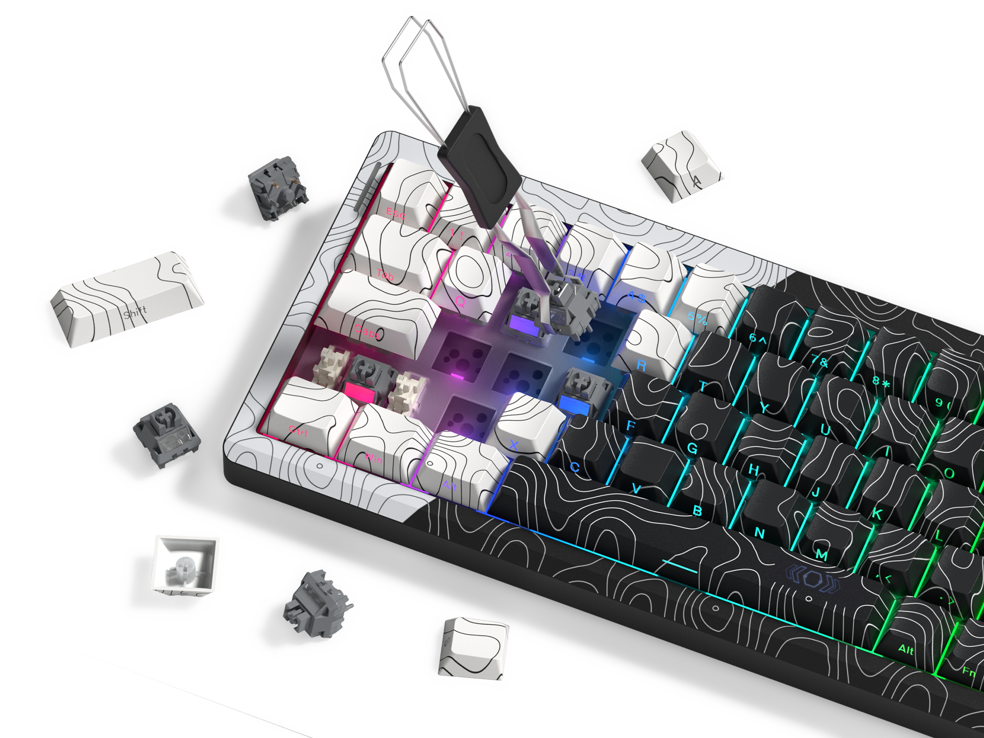 The full POM material ensures that the switches are not easily worn out after prolonged use. The switches are pre-lubed for better typing feel and sound. Additionally, the LED diffuser design allows the RGB lighting to be more evenly distributed, thereby enhancing the keyboard's lighting effects