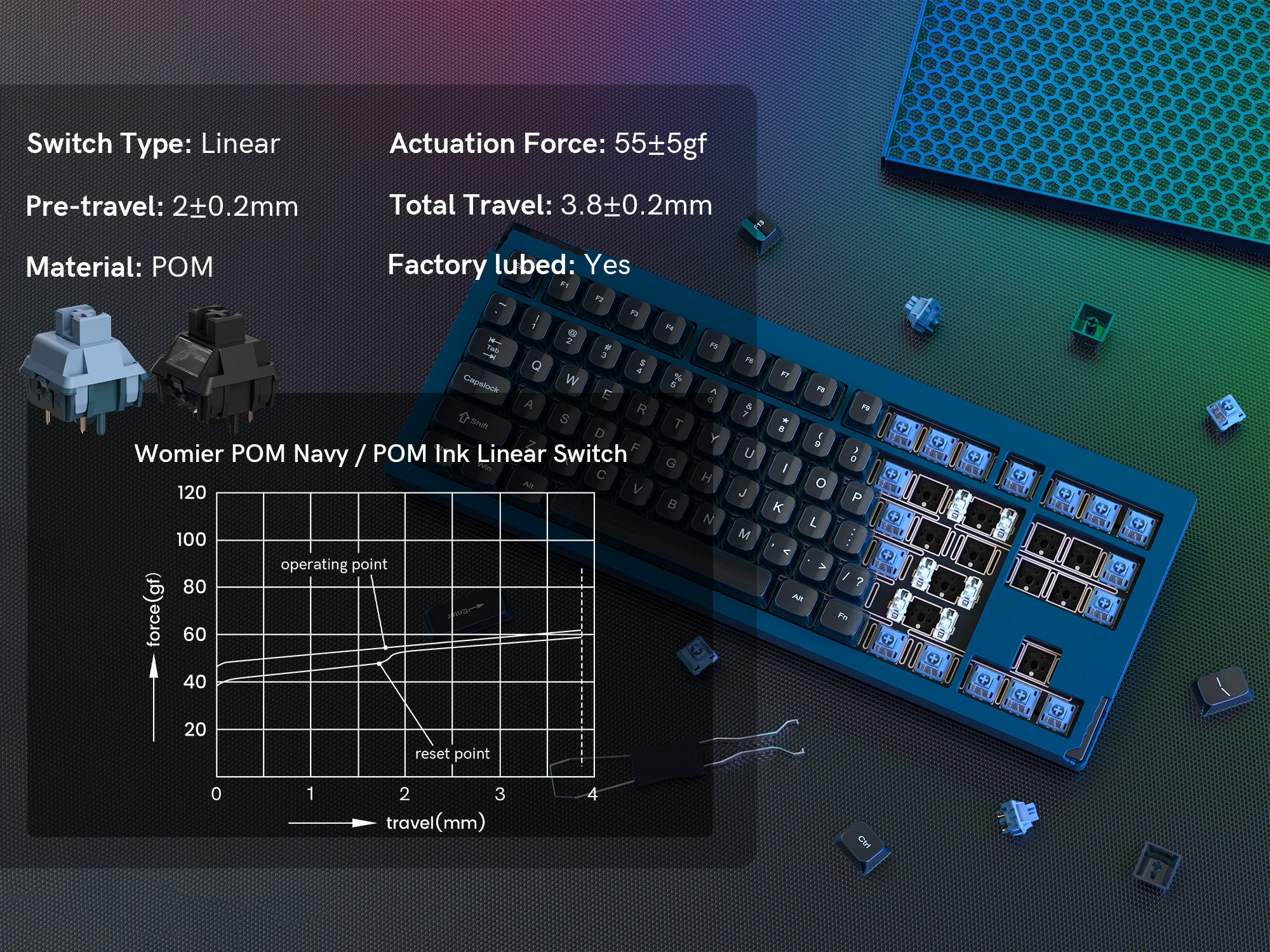 - Switches: Womier POM Navy (Anodized Blue version)/POM Ink switches (Anodized Black version)