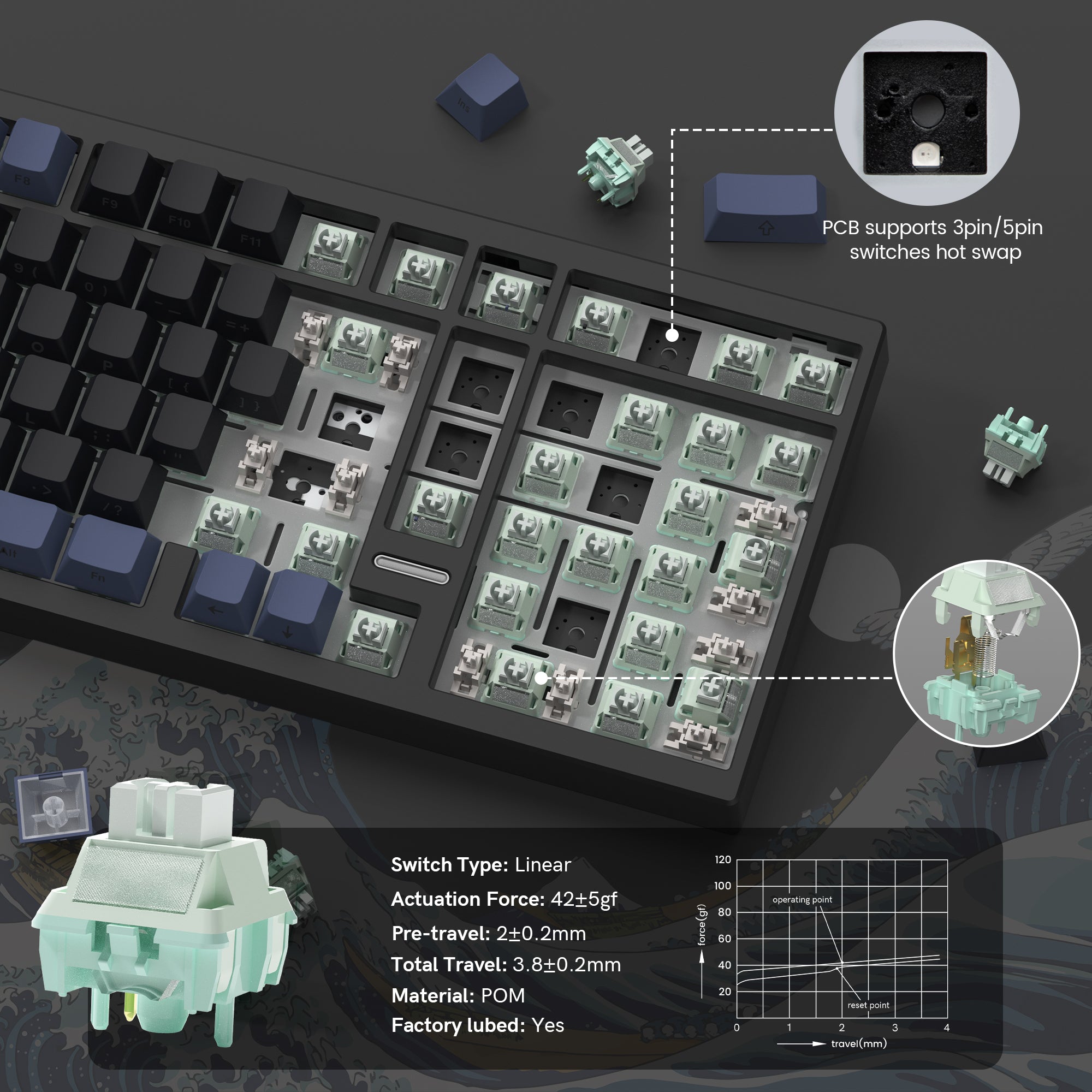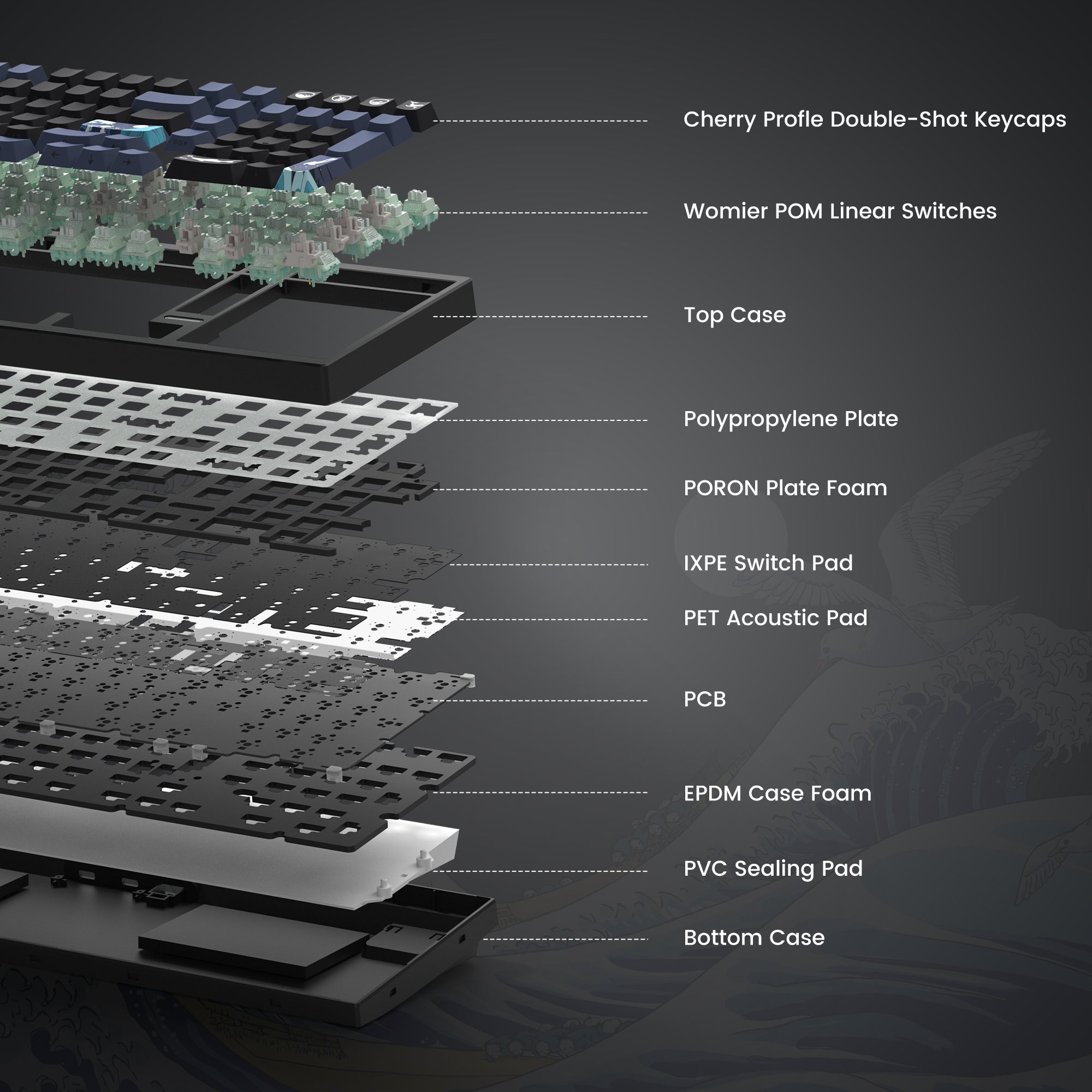 Built with factory pre-lubed Womier POM switches, offering a smooth keystroke, stable feedback, and reduced friction. Each press feels consistent and refined right out of the box, with no additional tuning required.