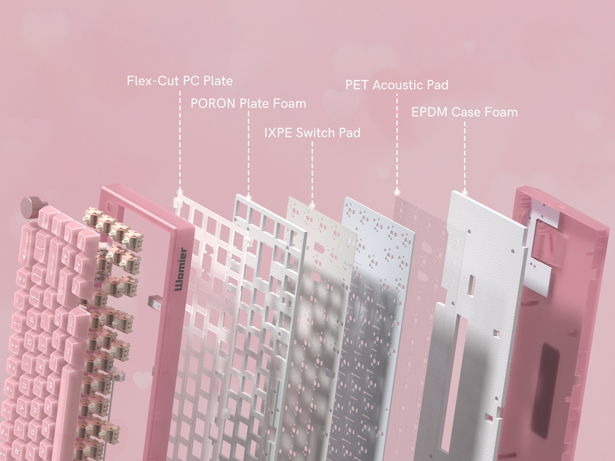 - Keycap: XDA profile PC keycaps (Pink)/ Cherry profile PBT keycaps (Ordinary)