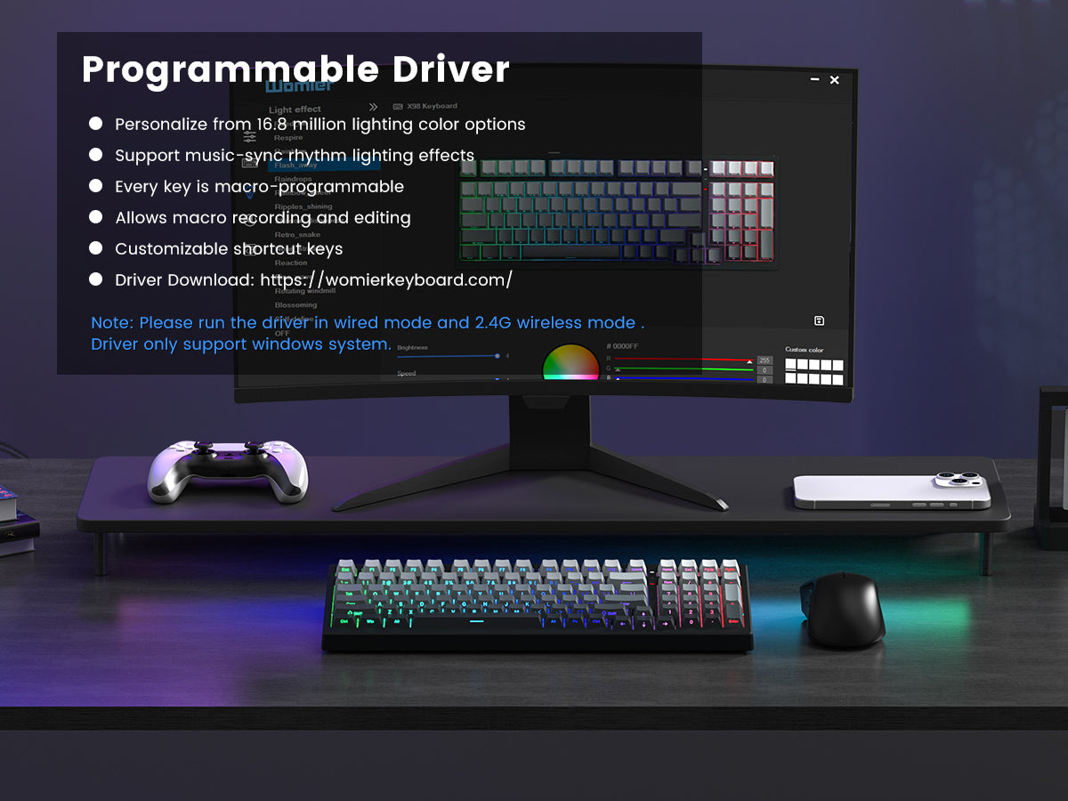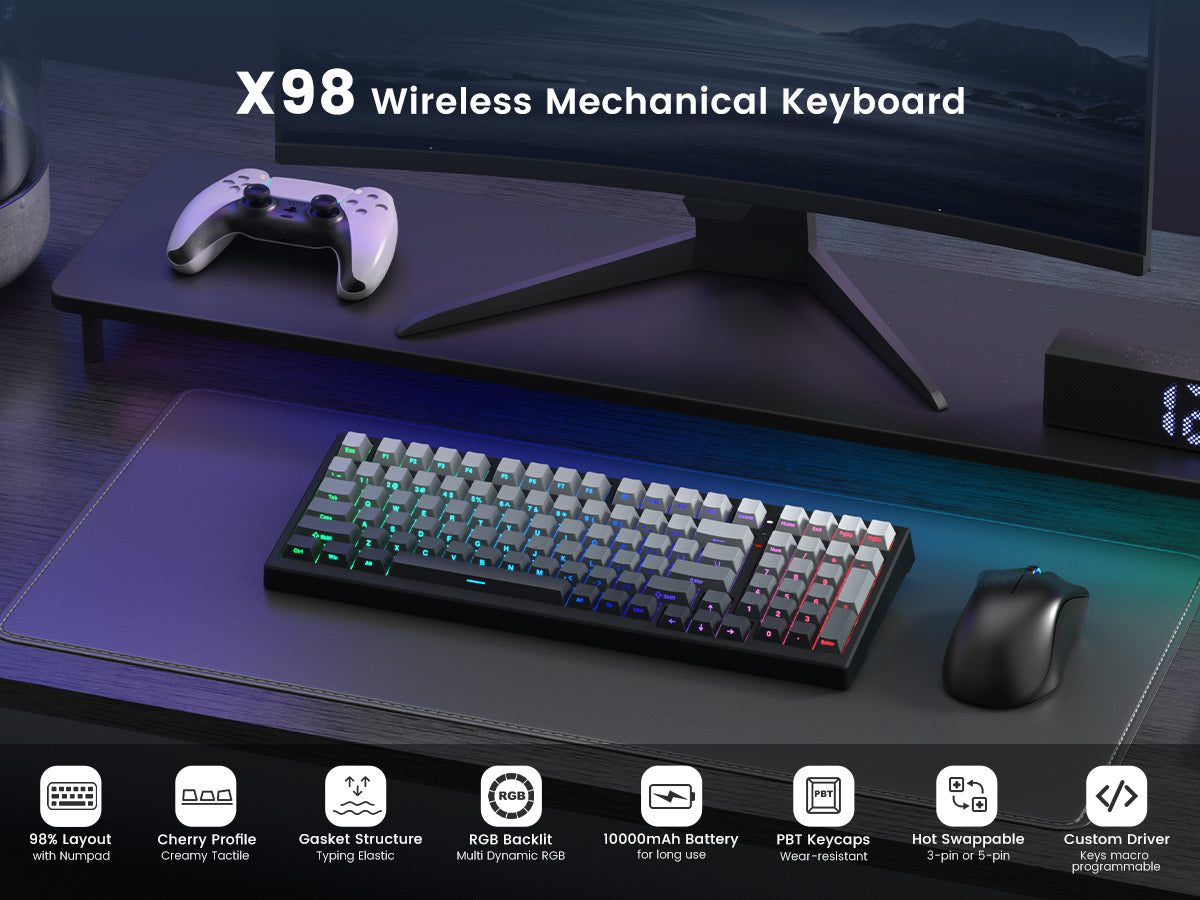 Step up your skills with 1000Hz polling rate and 2ms low latency in wired mode for lightning-fast response. Anti-ghosting ensures accuracy, N key rollover. Keys macro programmable, you can customize the function of single key or key combination function through X98 driver. This feature-packed mechanical gaming keyboard wireless makes a powerful companion for both esports and productivity