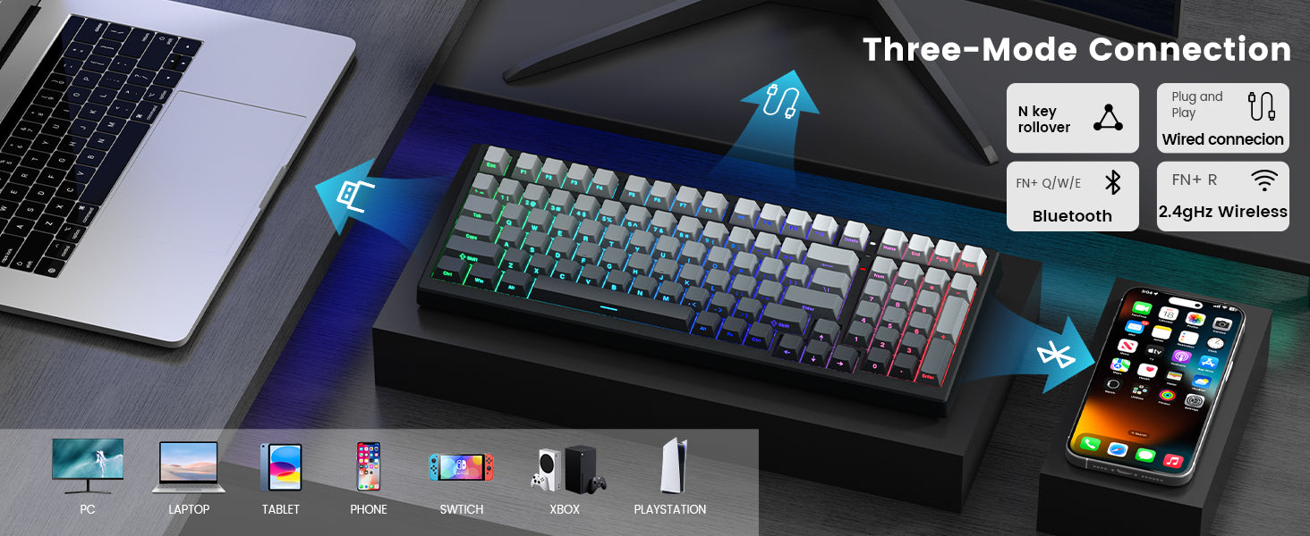 Womier X98 wireless mechanical keyboard supports USB-C wired, Bluetooth 5.0, and 2.4GHz wireless connections for seamless device switching. Compatible with Windows and macOS, it works perfectly with laptops, desktops, and tablets. With a 10,000mAh battery, enjoy extended wireless use for work or gaming.