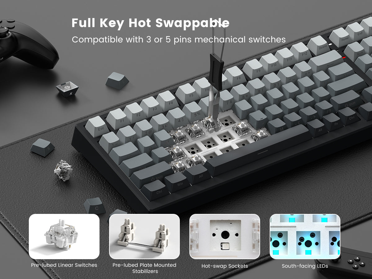 This wireless mechanical keyboard with hot-swap PCB supports 3-pin and 5-pin switches, letting you easily swap keycaps and switches. Pre-lubed stabilizers and linear switches provide a creamy, smooth keystroke, perfect for typing and gaming.
