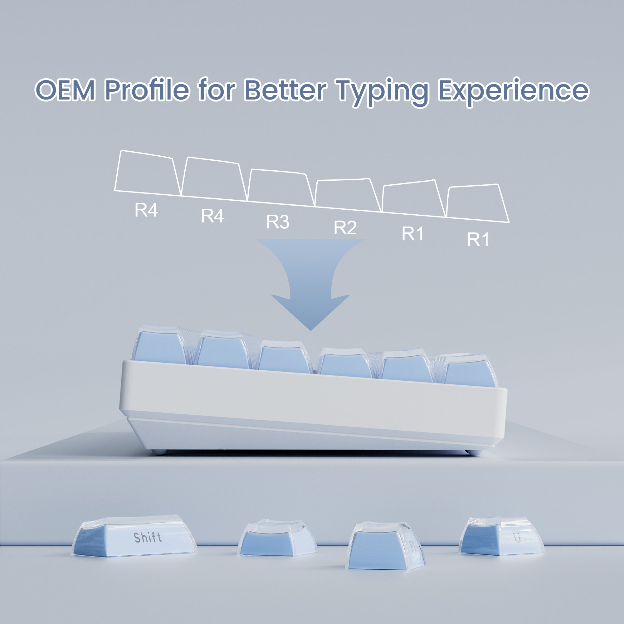 Similar to the Cherry profile, the OEM profile keycaps are ergonomically designed and their curved height can better fit the fingers and reduce fatigue caused by prolonged use.