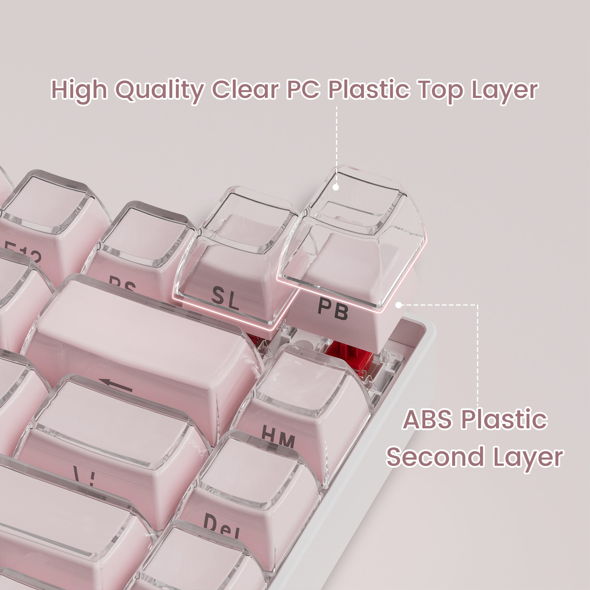 The legends on the double-shot keycaps are molded with 2 separate layers to prevent the legends from scratching or fading from daily use, and will not fade over time.