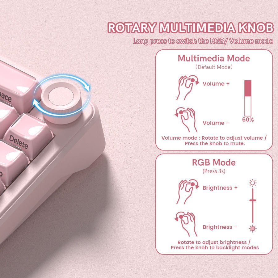 The L65 features a built-in multifunction knob for quick control of sound and lighting.Rotate to adjust volume and press to mute. Long press for 3 seconds to switch modes—rotate to change RGB brightness and press to cycle lighting effects.A clean, intuitive design that keeps your compact keyboard efficient and clutter-free.